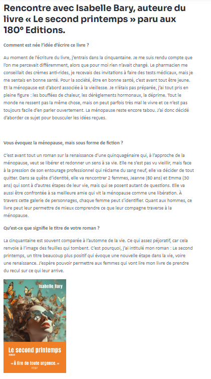 C'est un vent de renouveau qui souffle sur la scène littéraire avec la sortie du dernier roman de l'auteure lasnoise Isabelle Bary. Le second printemps...